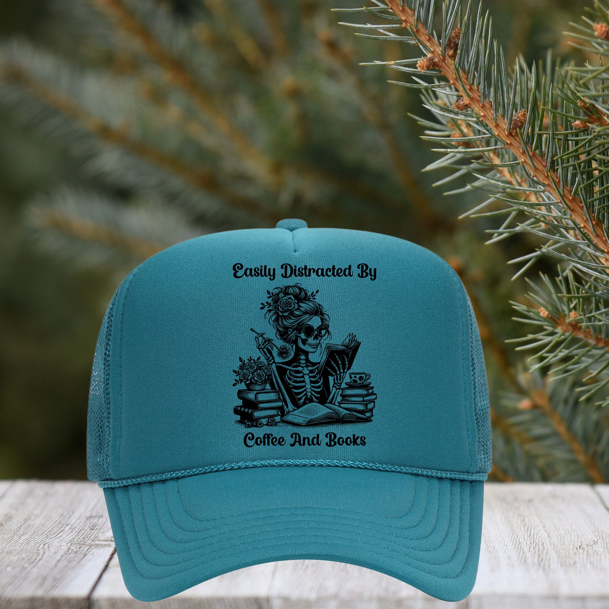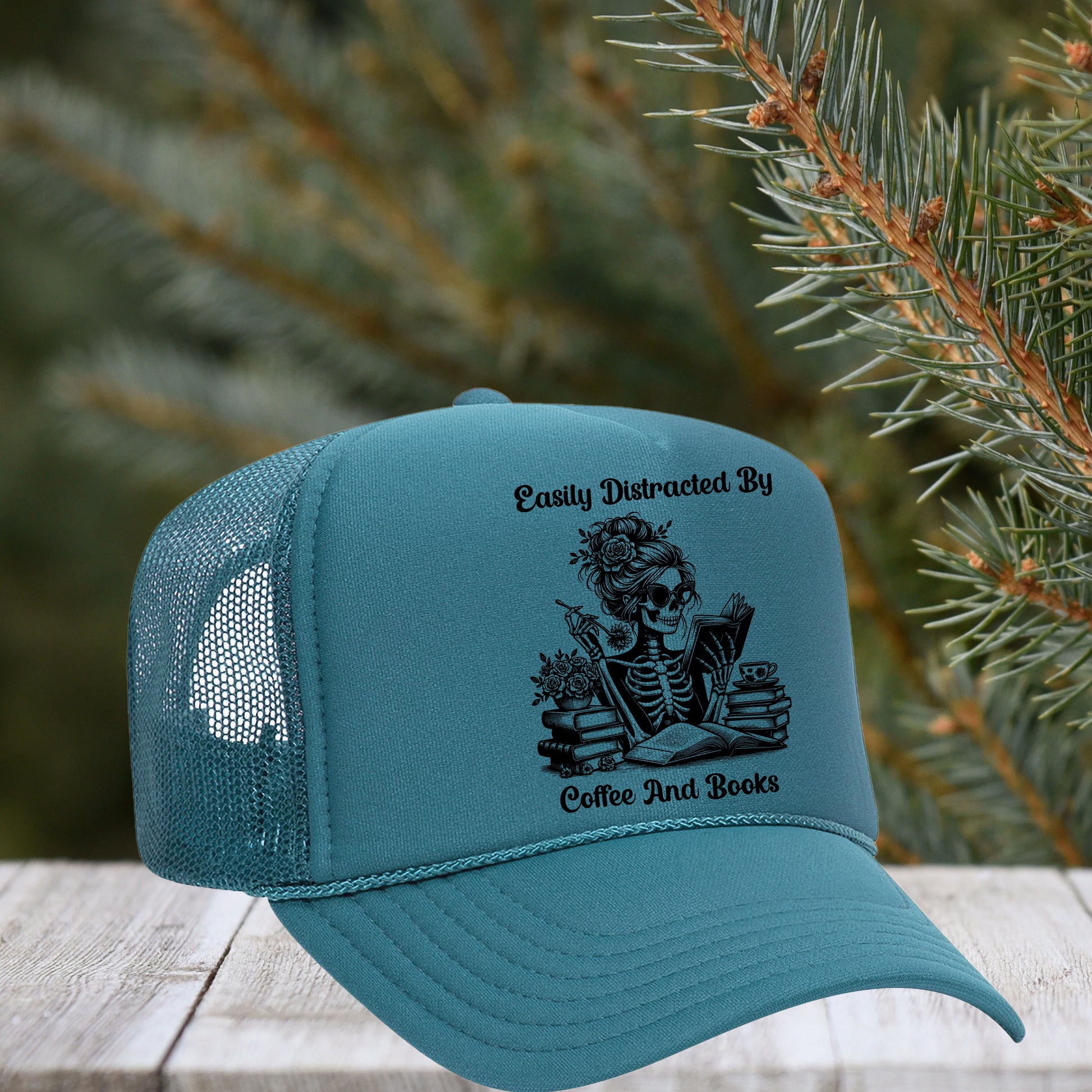 This "Easily Distracted By Coffee And Books" DTF trucker hat consists of the following: