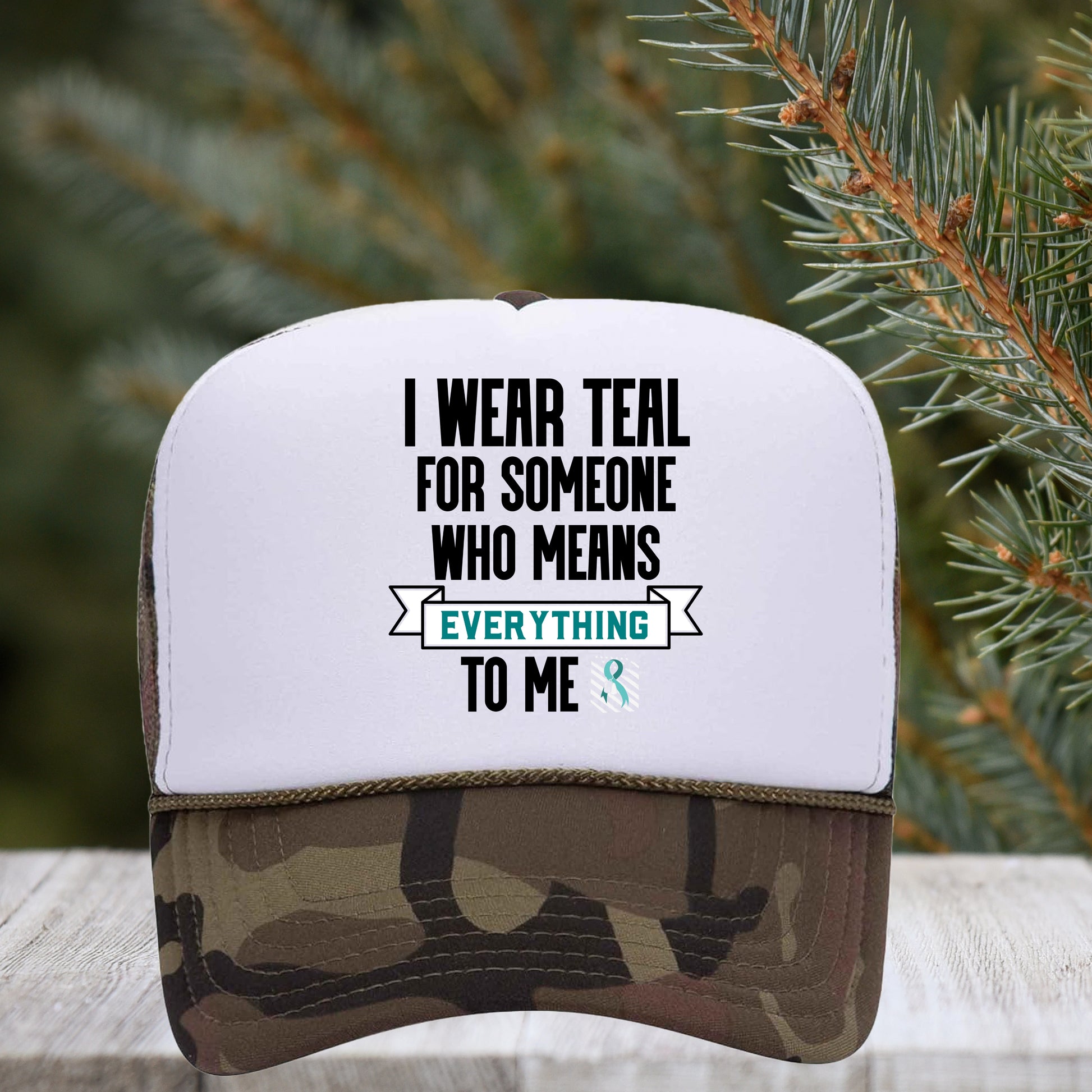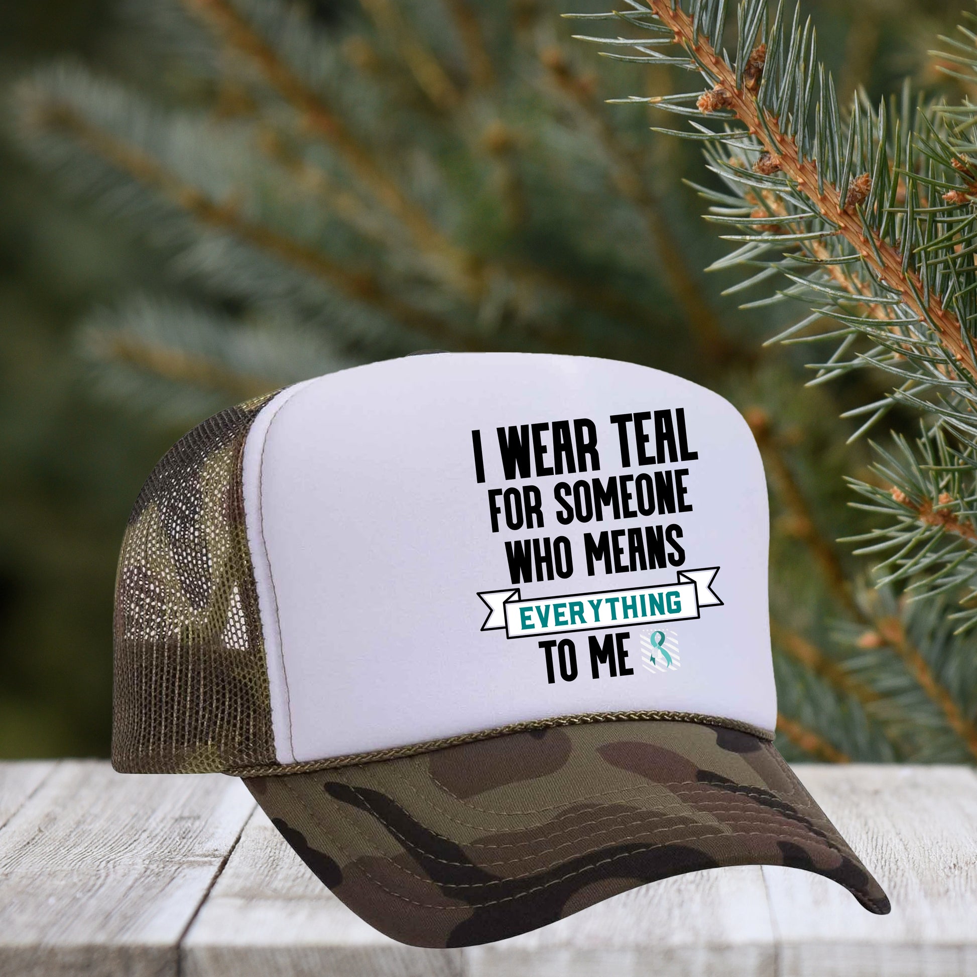 This "I Wear Teal For Someone Who Means Everything To Me" DTF trucker hat consists of the following: