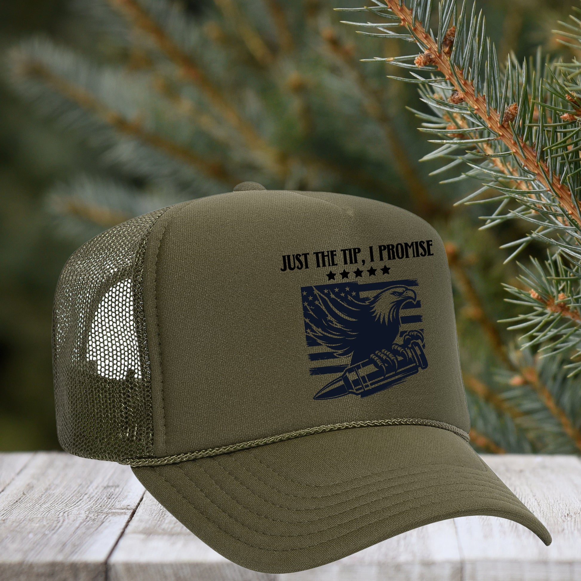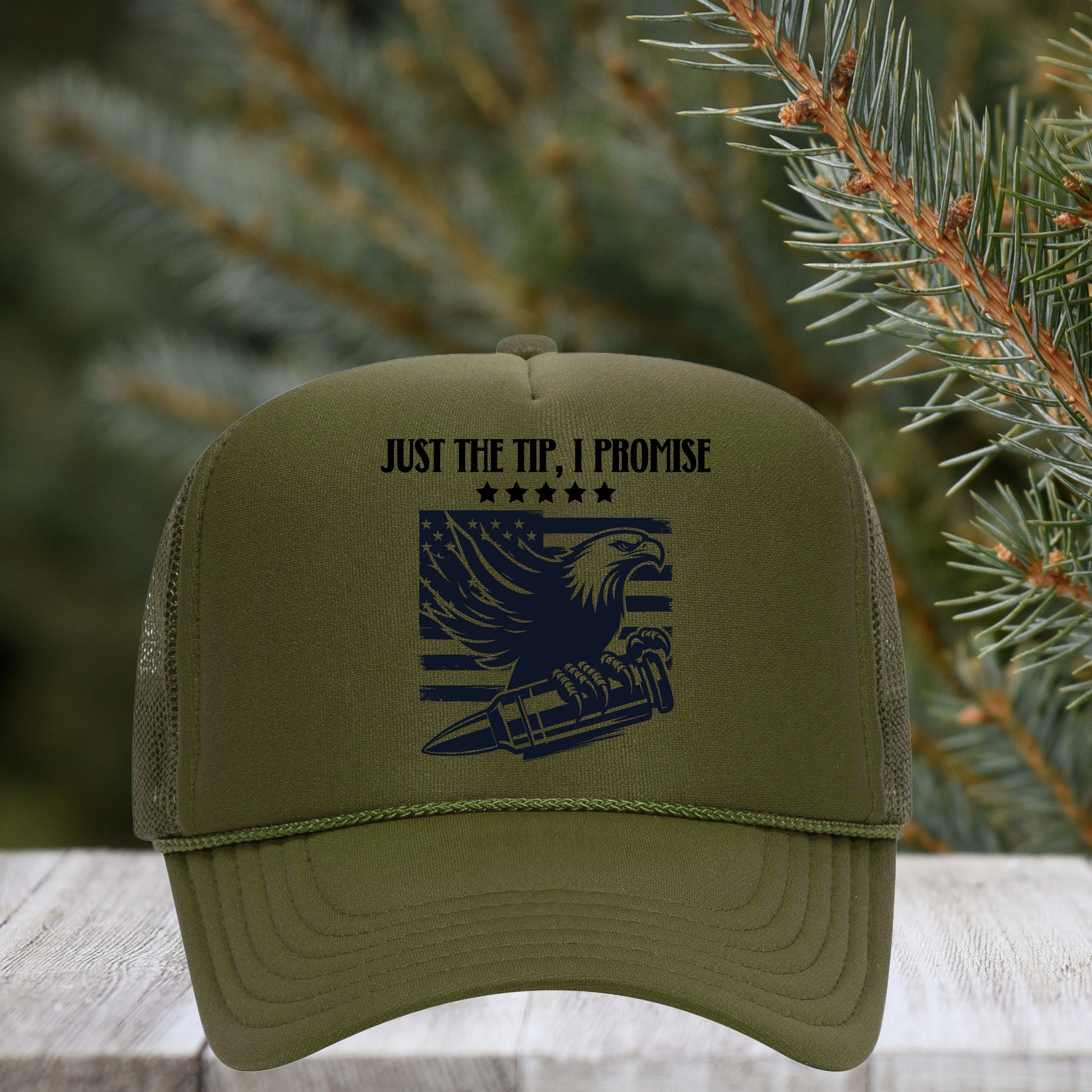 This "Just The Tip, I Promise" DTF trucker hat consists of the following: