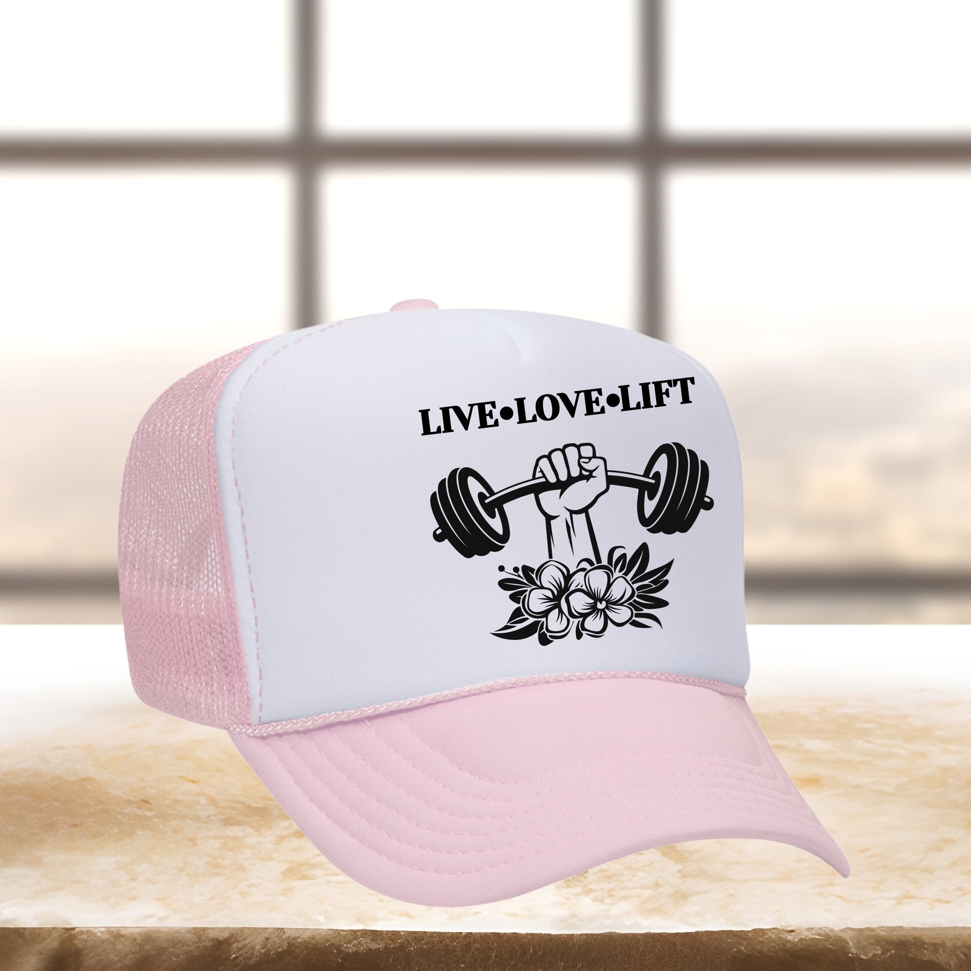 This "Live-Love-Lift" DTF trucker hat consists of the following: