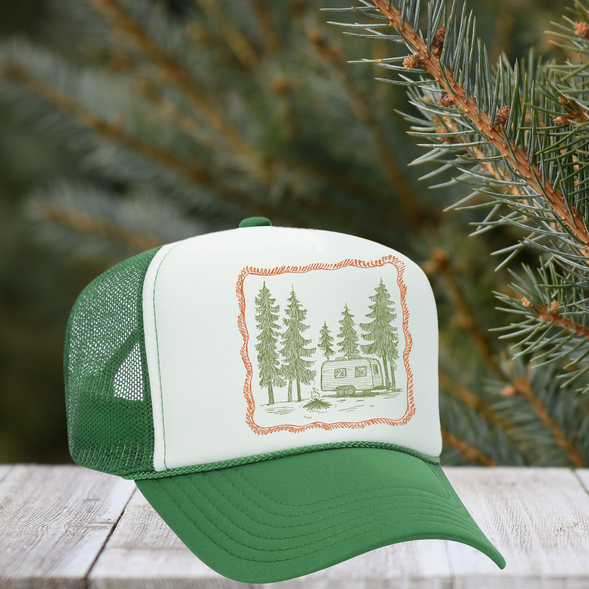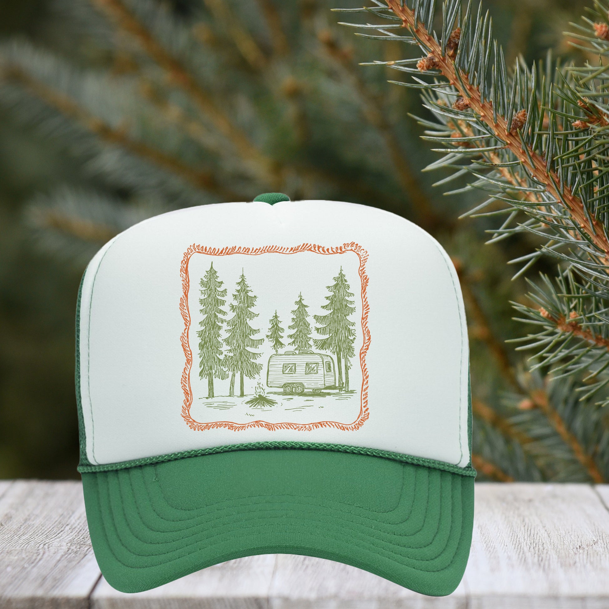 This "OG Camping" DTF trucker hat consists of the following: