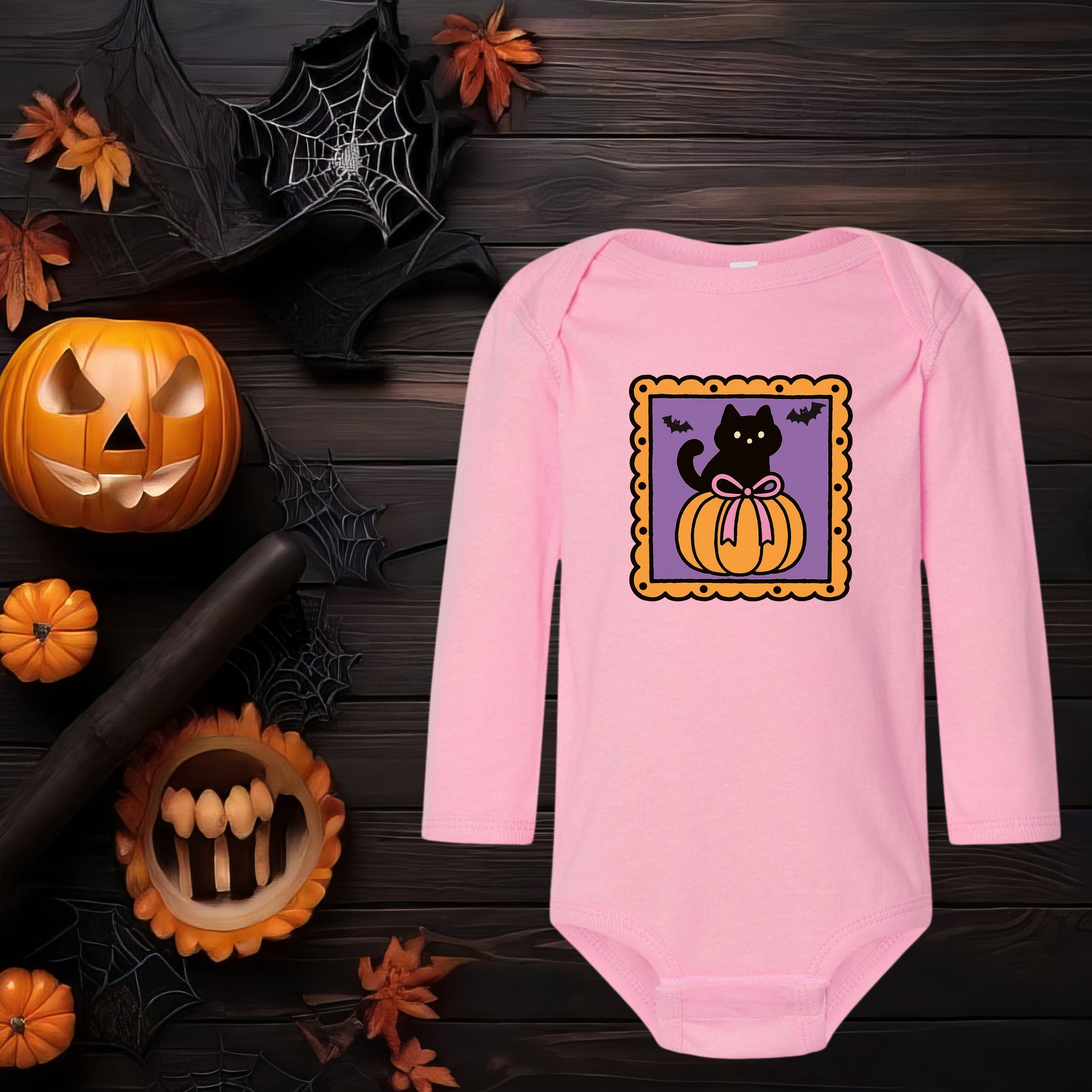 This infant "Black Kitten Frame" long sleeved onsie has the following