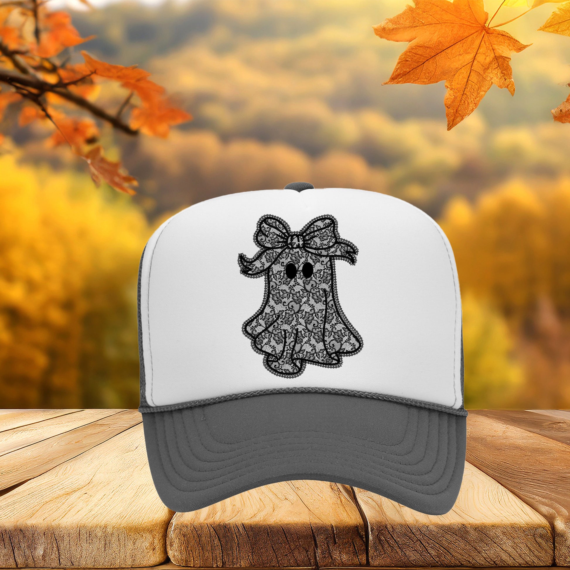 This "Black Lace Ghost" DTF trucker hat consists of the following: