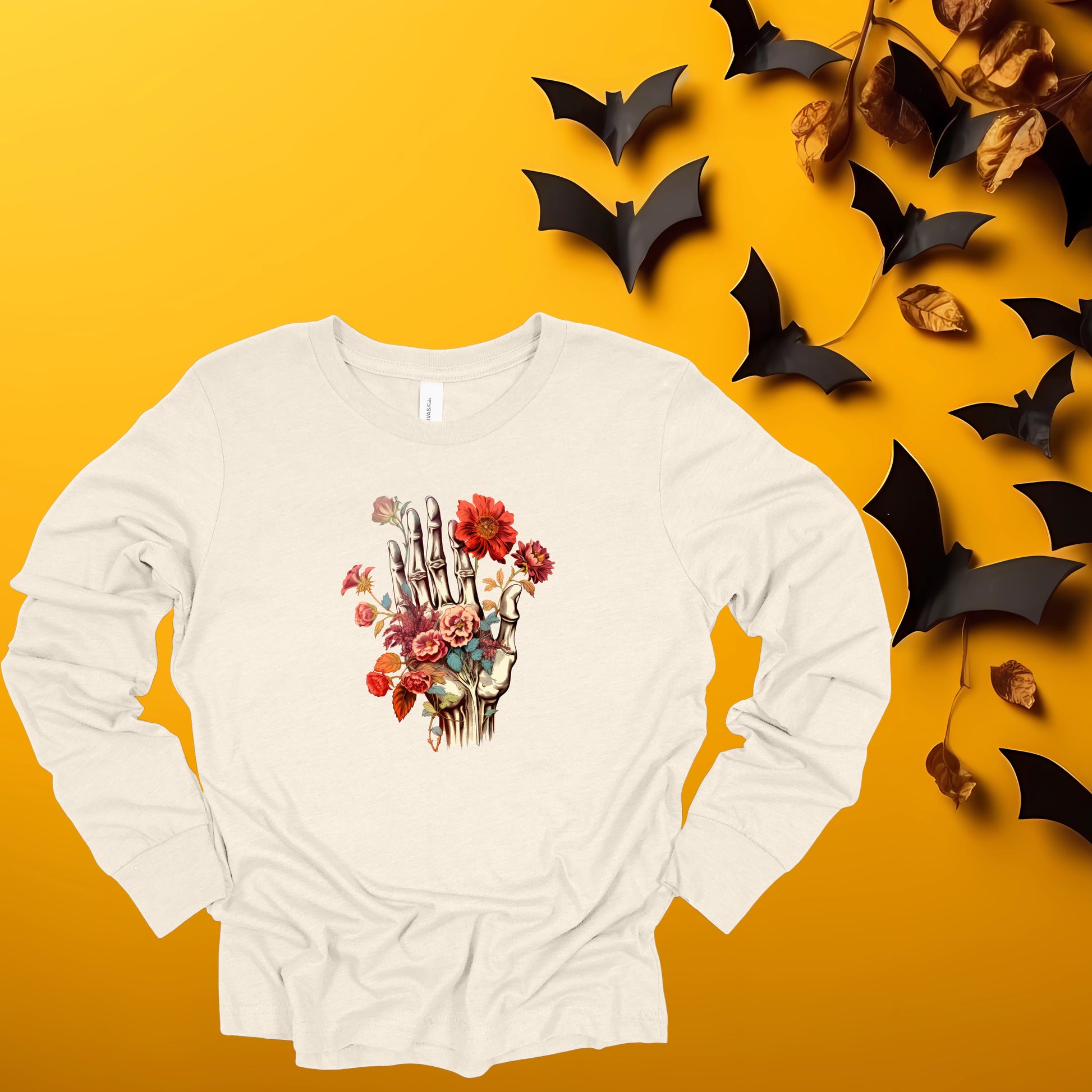 This youth "Floral Skeleton Hand" long sleeved tee has the following