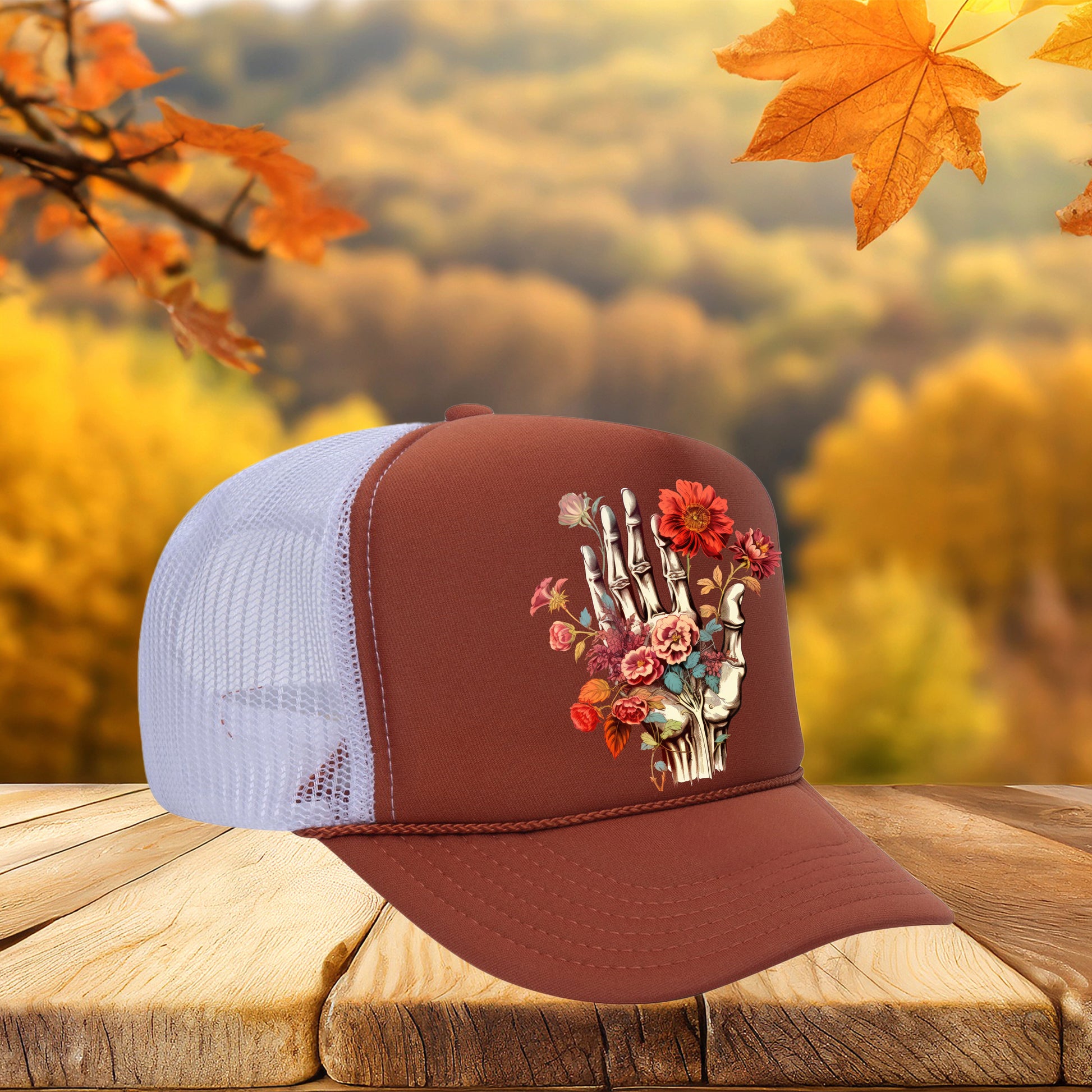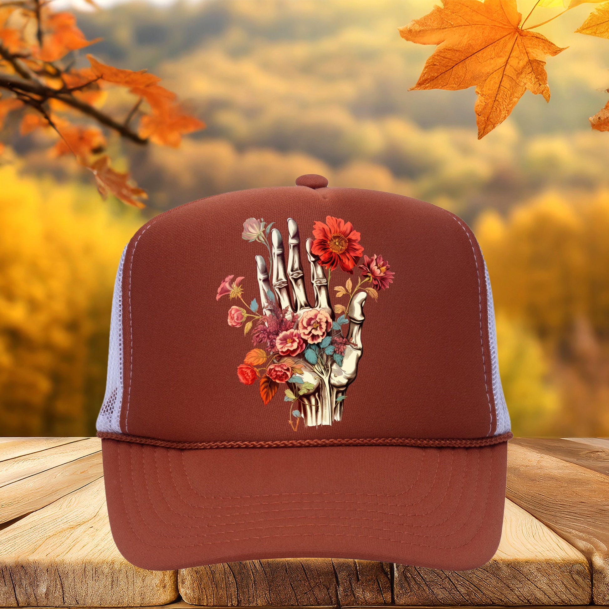 This "Floral Skeleton Hand" DTF trucker hat consists of the following: