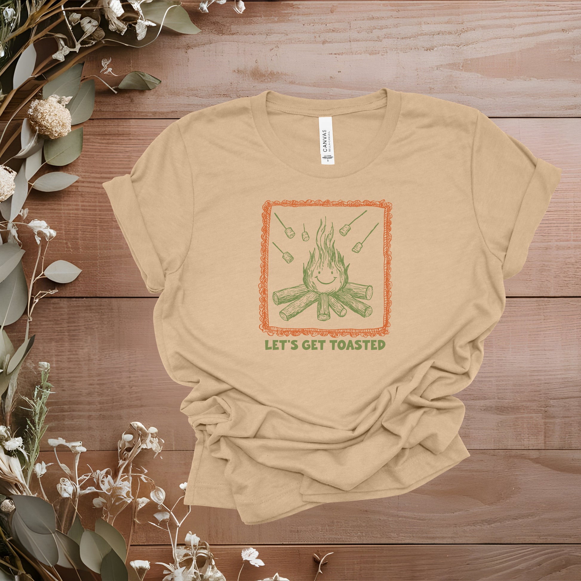 This adult "Let's Get Toasted" short sleeved tee has the following