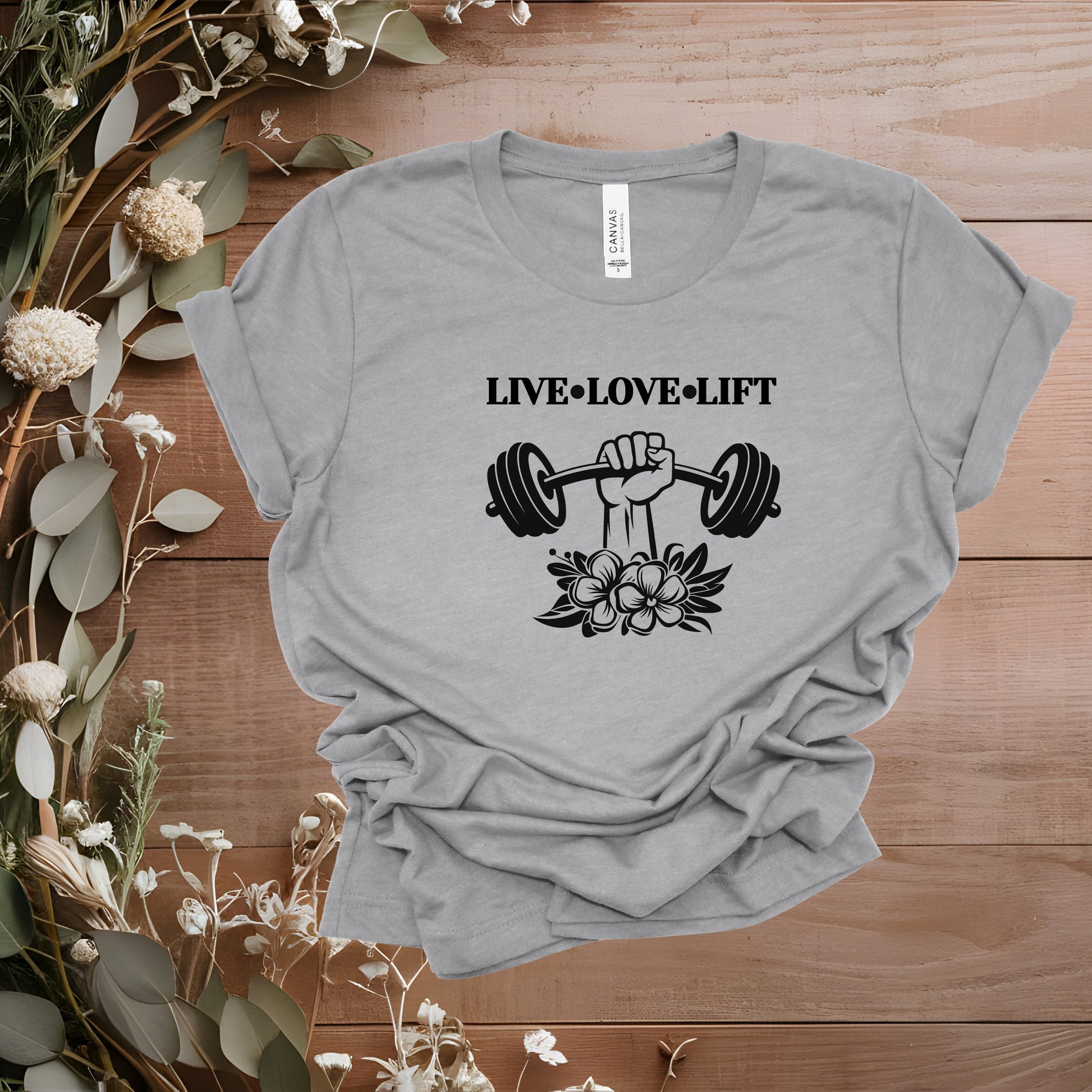 This adult "LIVE*LOVE*LIFT" short sleeved tee has the following