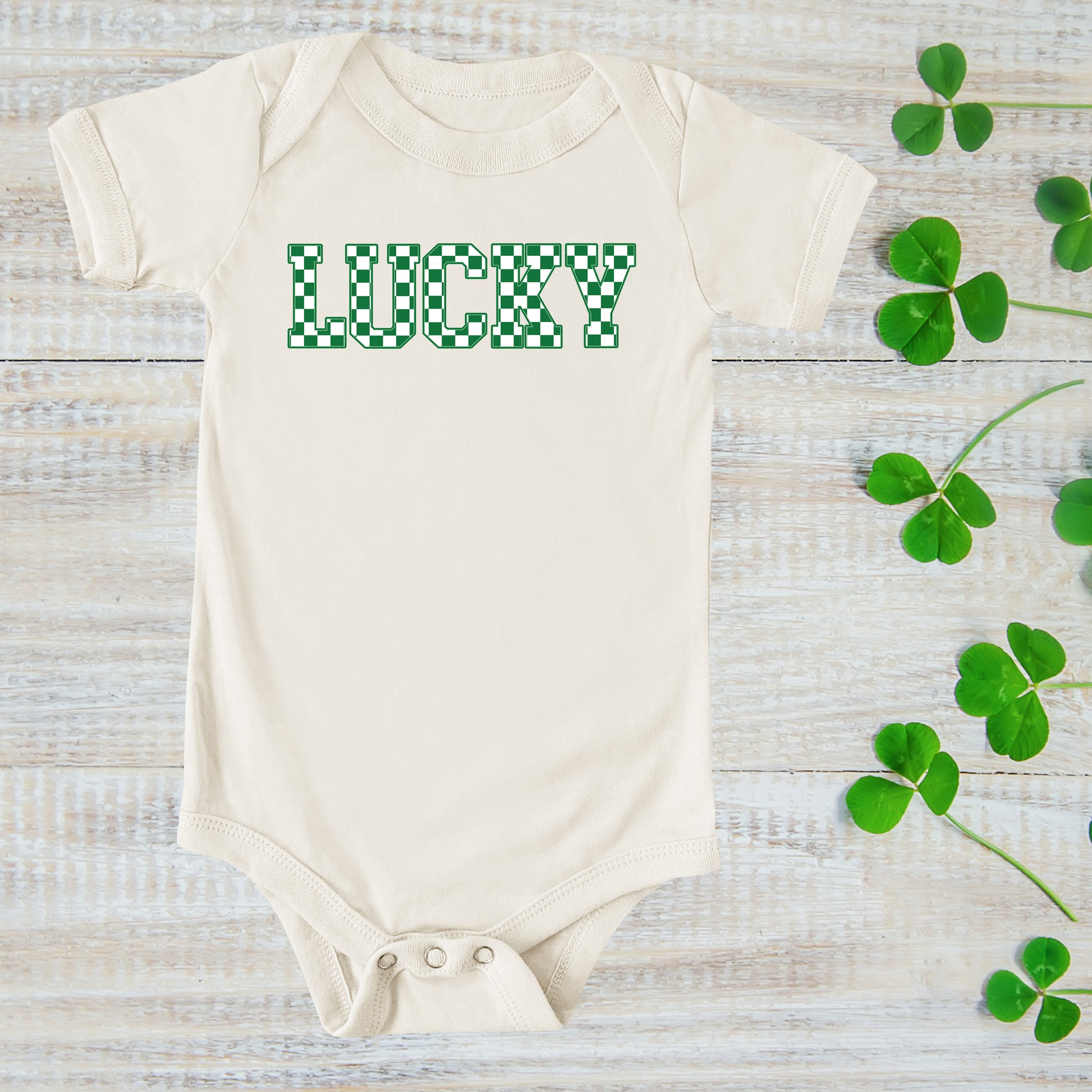 This infant "Lucky" short sleeved onsie has the following