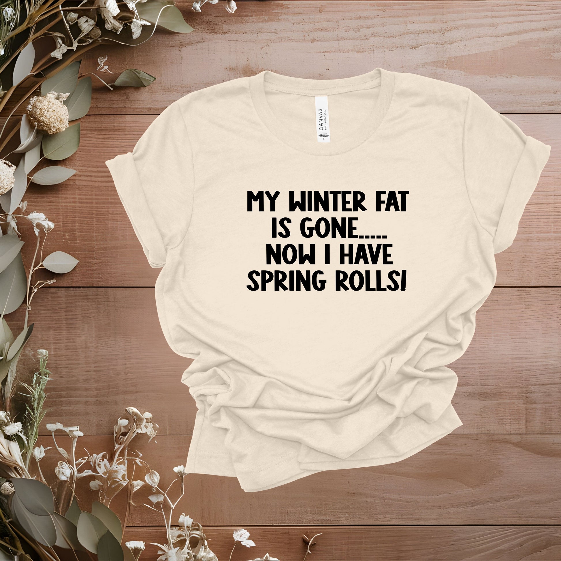 This adult "My Winter Fat Is Gone...Now I Have Spring Rolls" short sleeved tee has the following