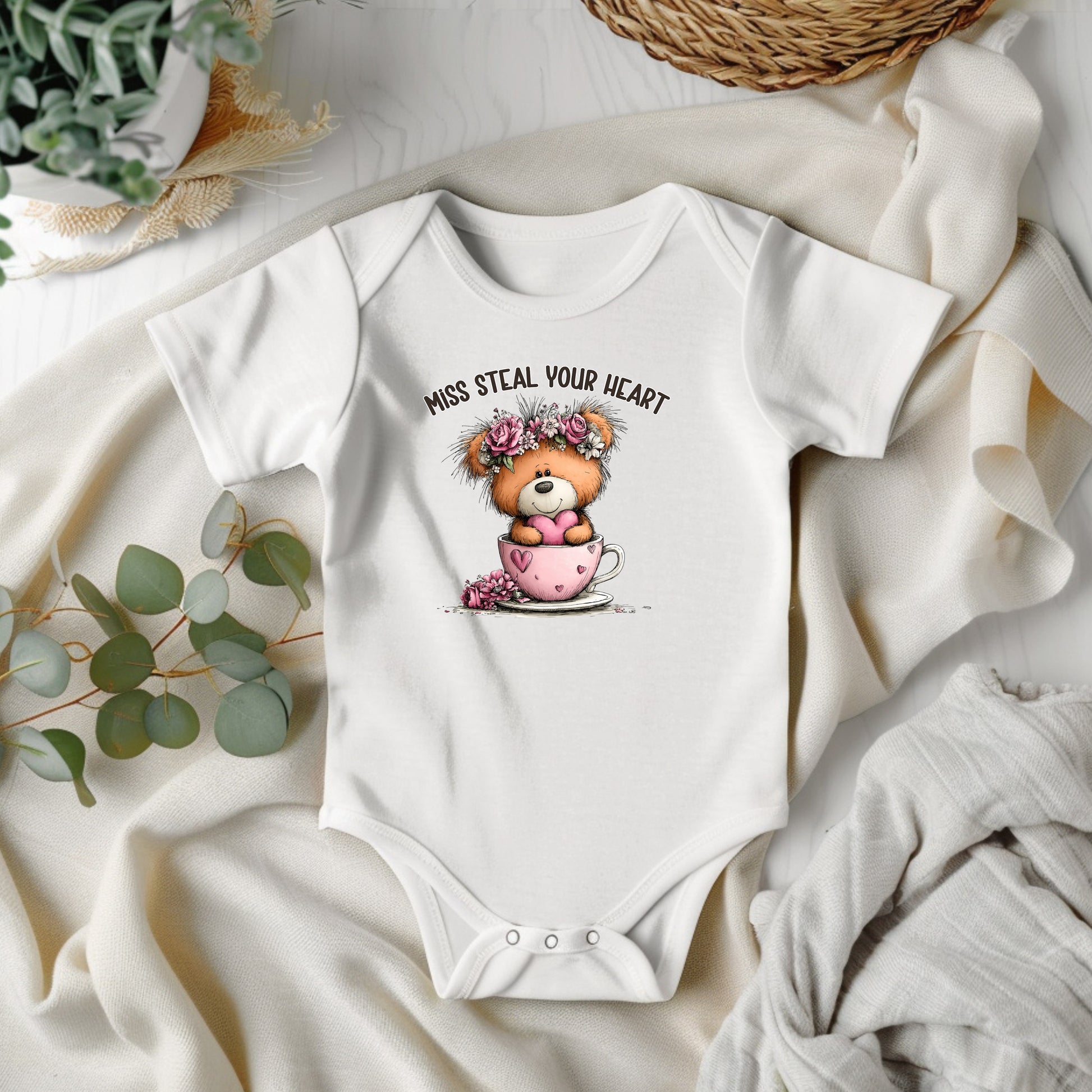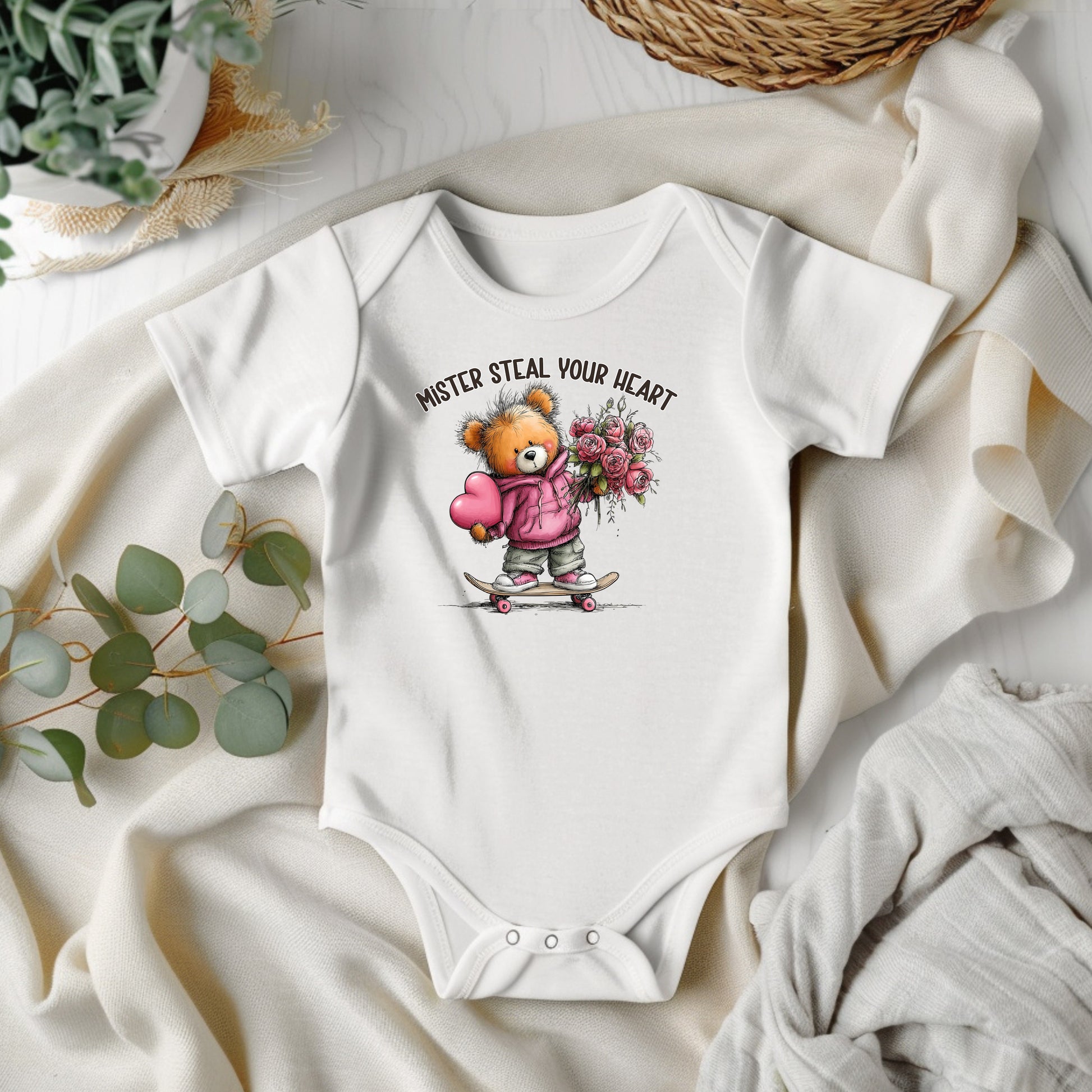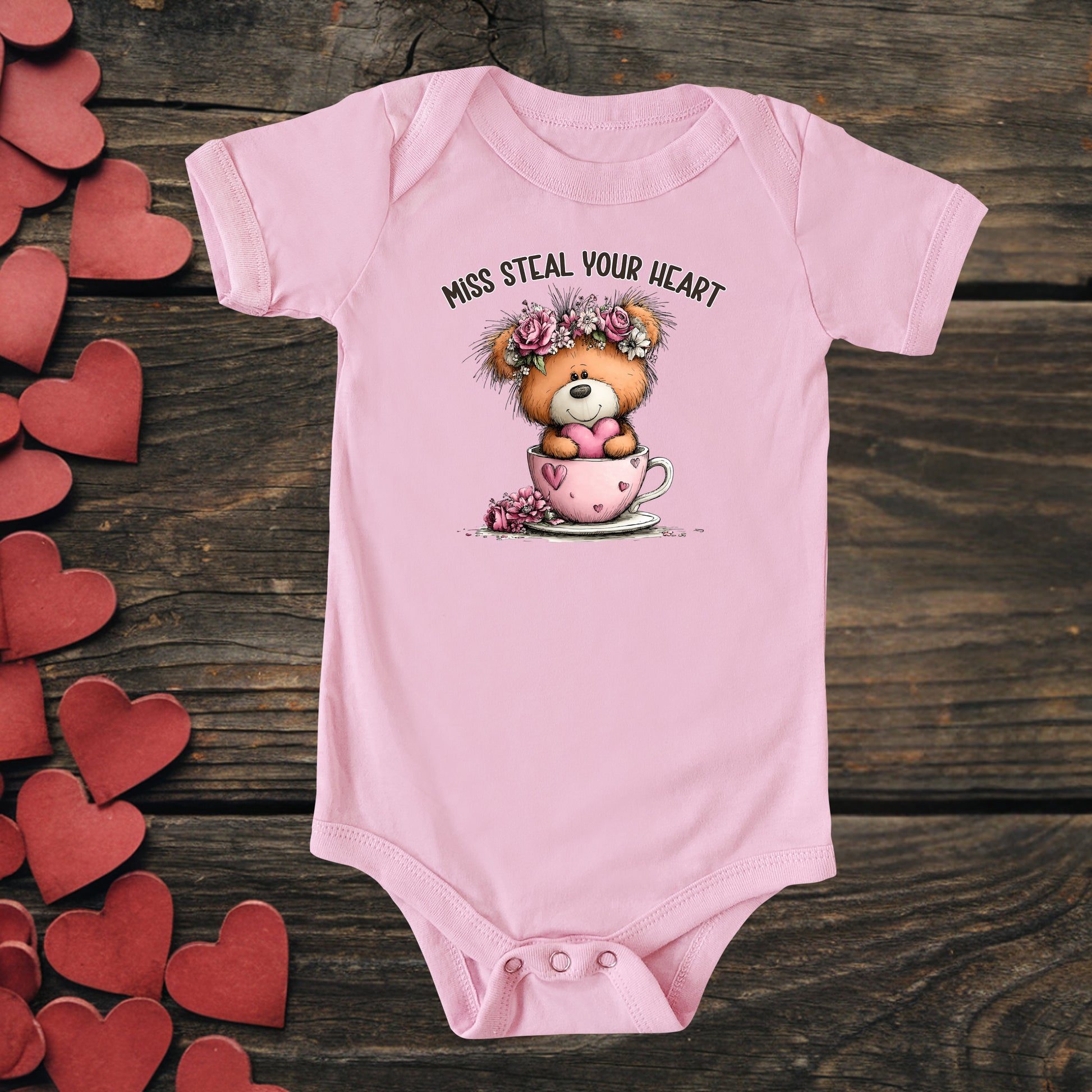 This infant "Steal Your Heart" short sleeved onsie has the following
