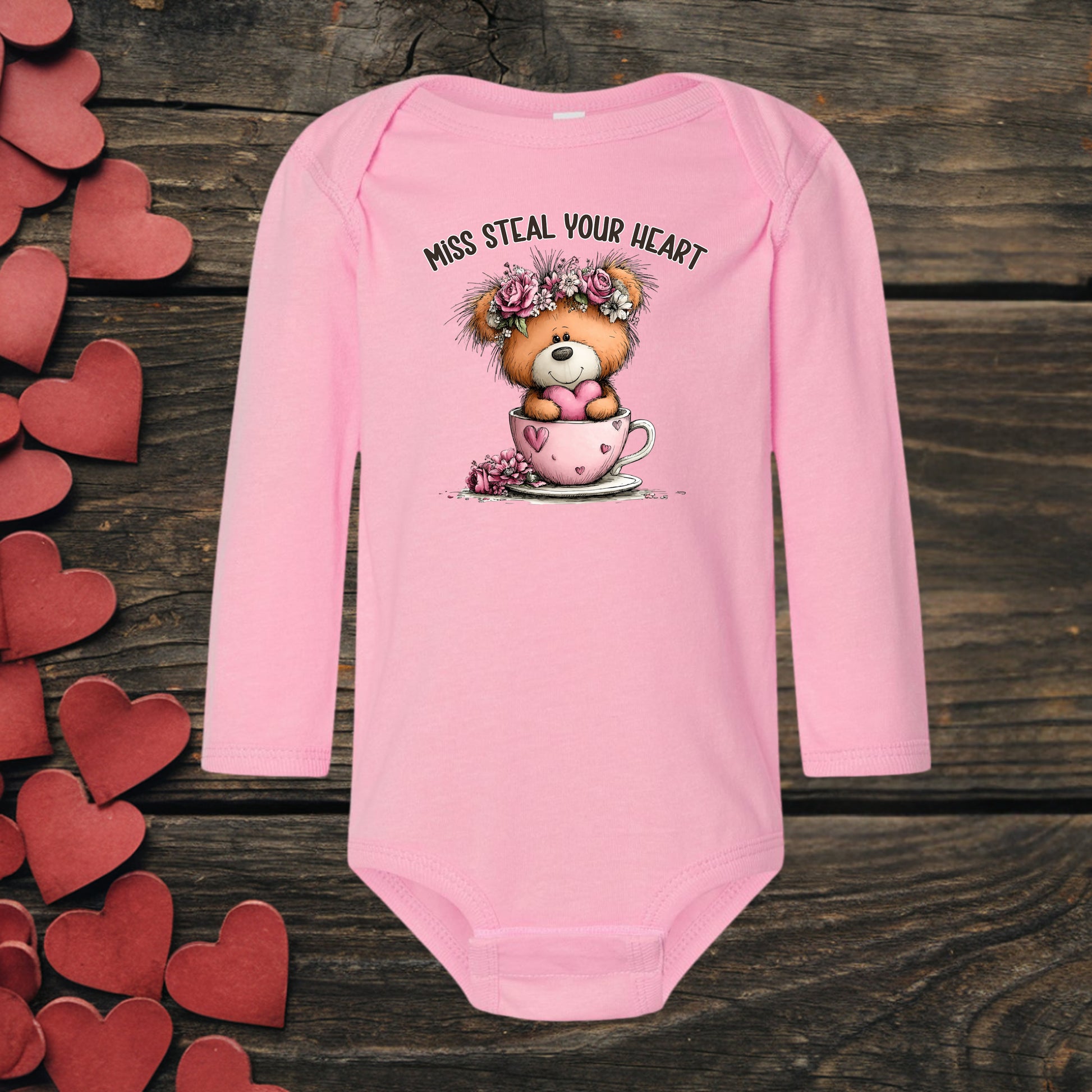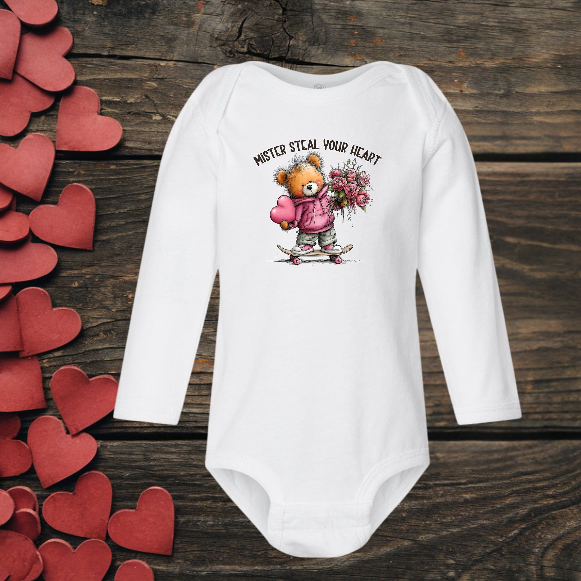This infant "Steal Your Heart" long sleeved onsie has the following
